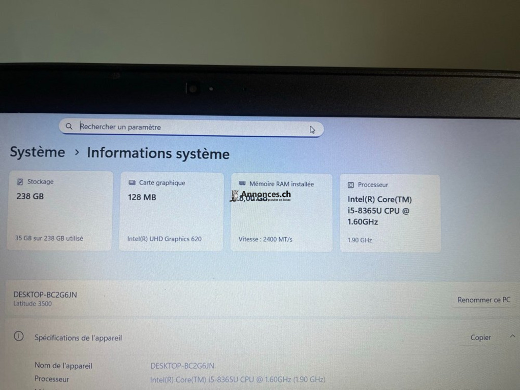 Vends PC pro Dell Latitude 3500 (15 pouces avec pavé numérique).