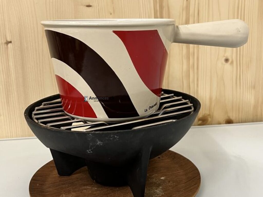 Un bel ensemble à fondue en fonte émaillée, brûleur en fonte et dessous de réchaud en bois.