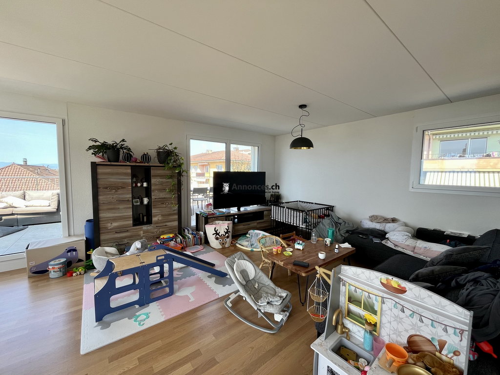 Ce charmant appartement de 3.5 pièces est constitué comme suit : Hall d'entrée, cuisine ouverte sur le séjour avec un accès sur la terrasse de 18m2, un réduit, un WC visiteur, une salle-de-bains avec WC, une salle-de-douche et deux chambres. Loyer : CHF 3'138.- + CHF 200.- de forfait de charges et une place de parc int...