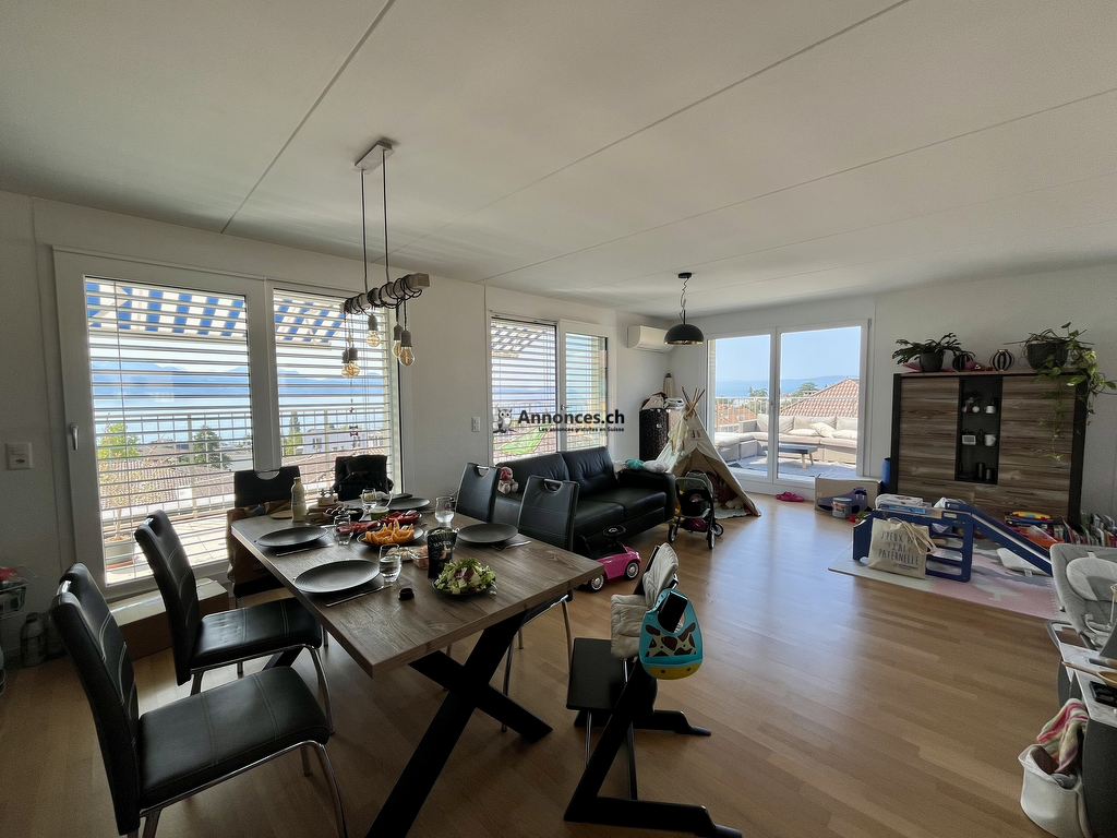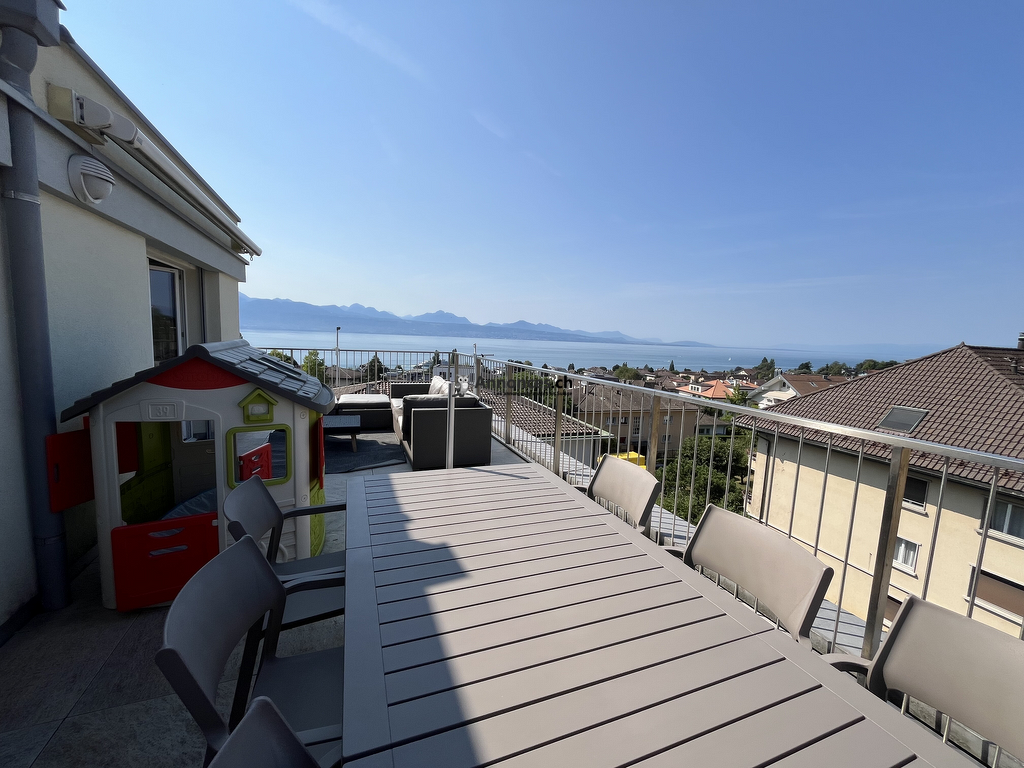 un grand séjour lumineux, belle vue lac et accès à la terrasse en attique