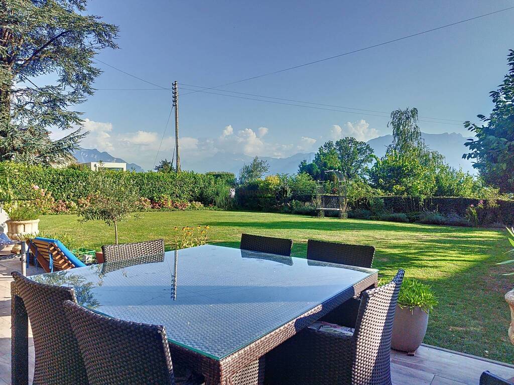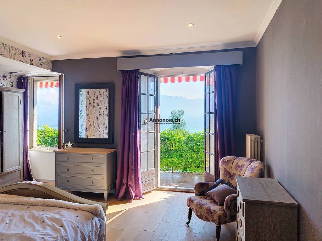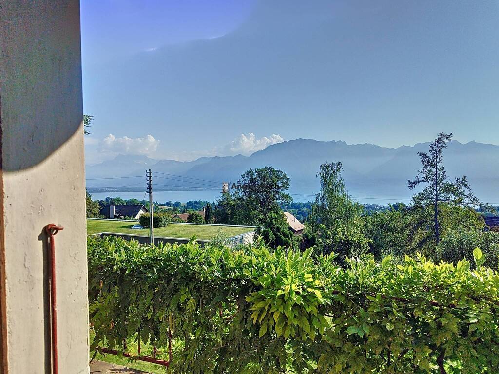 Un salon chaleureux avec une belle cheminée s'ouvre sur une salle à manger baignant de lumière. Depuis son balcon, profitez d'une vue imprenable sur le lac et les Alpes, sans aucun vis-à-vis. La cuisine, moderne et entièrement équipée, dispose d'une cuisinière à six plaques, d'un réfrigérateur américain, d'un vaste plan de travail et d'un ilôt central. Elle donne accès directement au jardin, parfait pour des repas en plein air. Un WC avec lavabo, rénové en 2021, complète ce niveau.