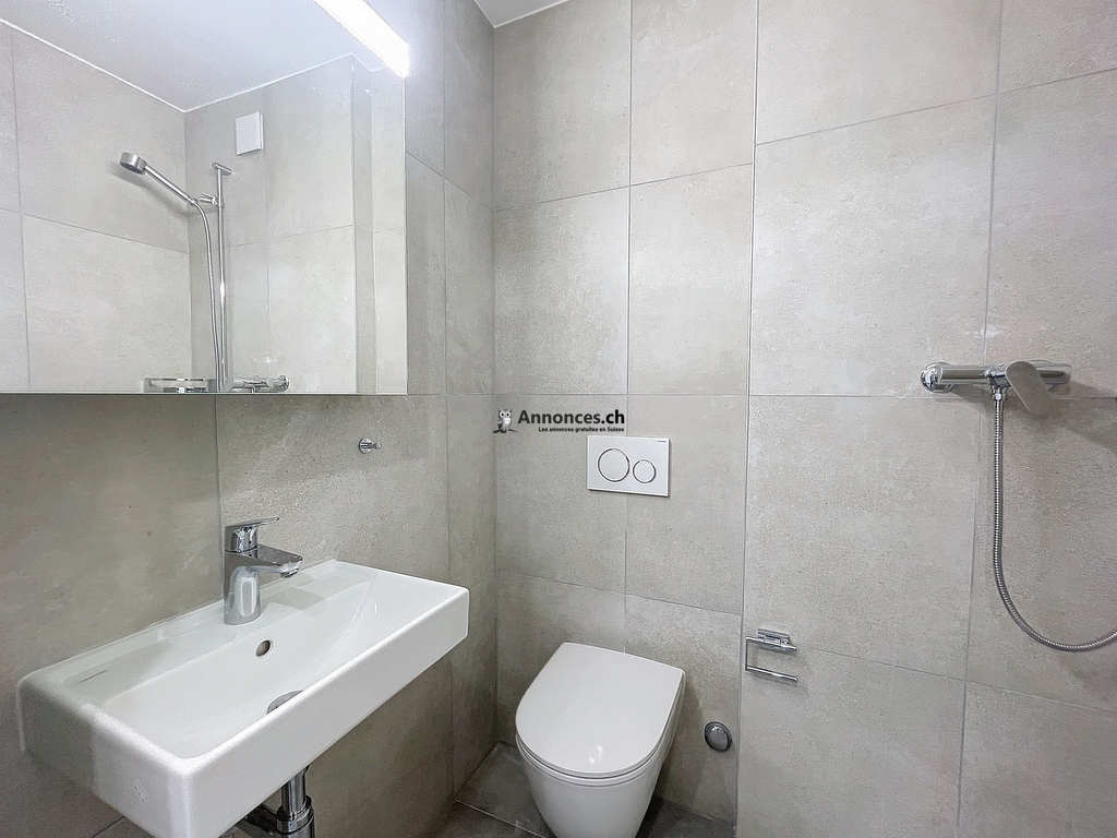 Ce charmant appartement de 3.5 pièces est constitué comme suit : Hall d'entrée, cuisine ouverte sur le séjour avec un accès sur la terrasse de 18m2, un réduit, un WC visiteur, une salle-de-bains avec WC, une salle-de-douche et deux chambres. Loyer : CHF 3'138.- + CHF 200.- de forfait de charges et une place de parc int...