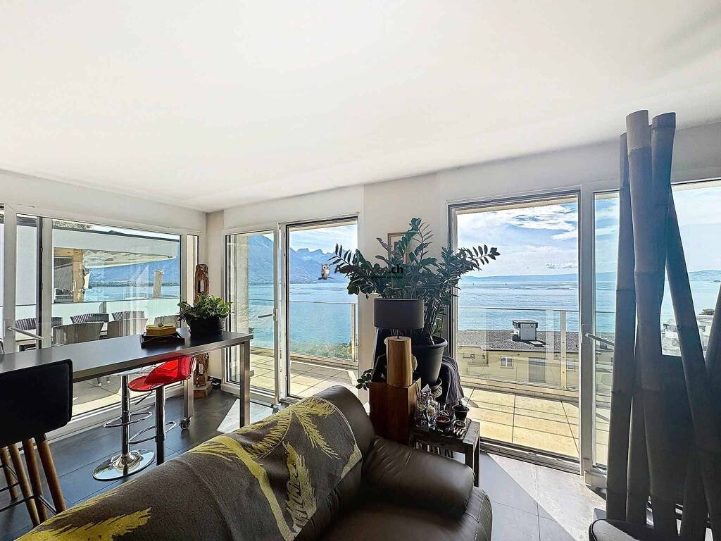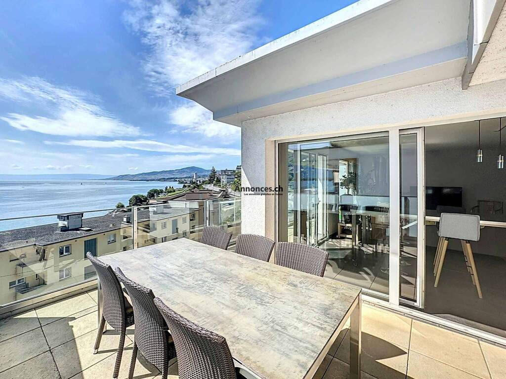 L'appartement est orienté Sud-Ouest et propose une très belle vue sur le lac et les Alpes. Sa magnifique terrasse apporte beaucoup de cachet et permet de bénéficier d'un extérieur très agréable en été. Ses finitions sont de bonnes qualités et il bénéficie en outre de portes coulissantes à toutes les pièces. Il est en très bon état et ne demanderait qu'un rafraîchissement de base en fonction des goûts personnels de chacun.