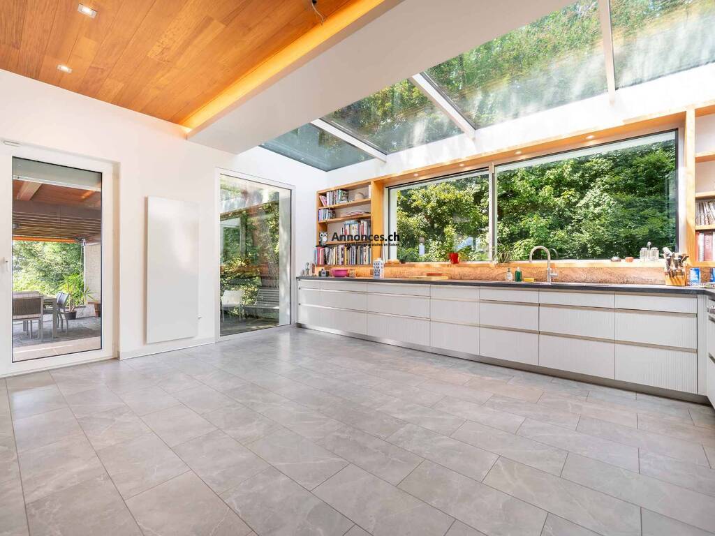 - Cuisine ultra contemporaine de 30 m² ouverte sur l’extérieur avec de larges baies vitrées.