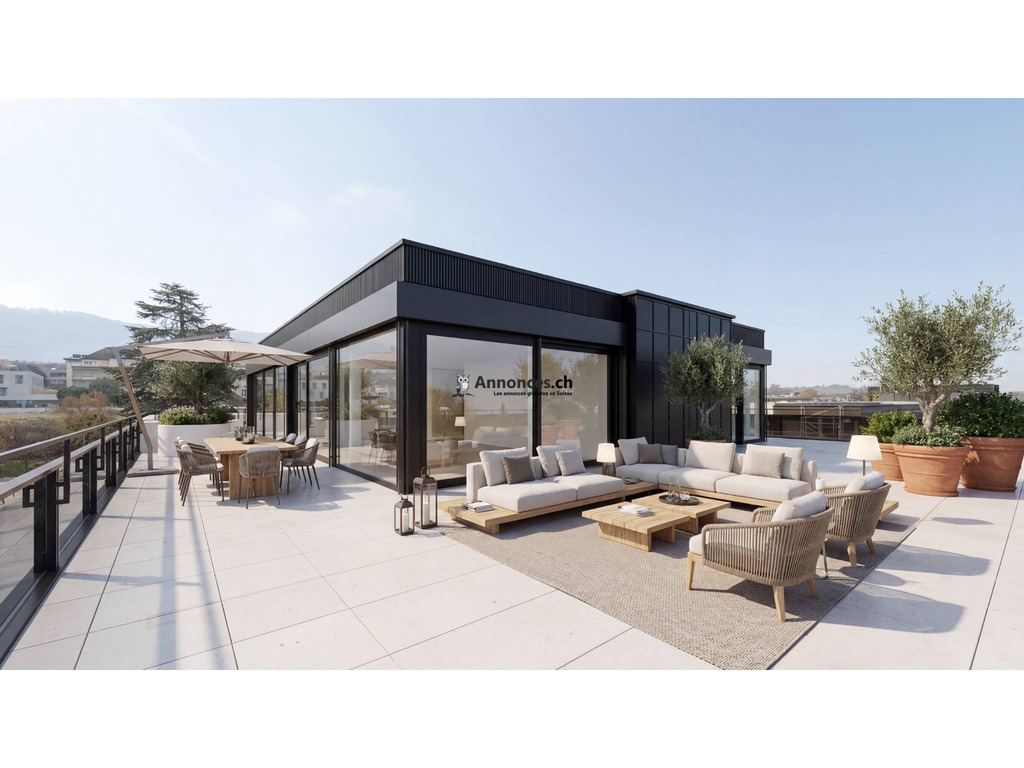 Que ce soit la cuisine-séjour ou les chambres, chaque pièce donne sur la terrasse rooftop d'environ 249m2. L'appartement se situe à l'extrémité du côté sud du bâtiment. Une cave de 7m2 est également à disposition.